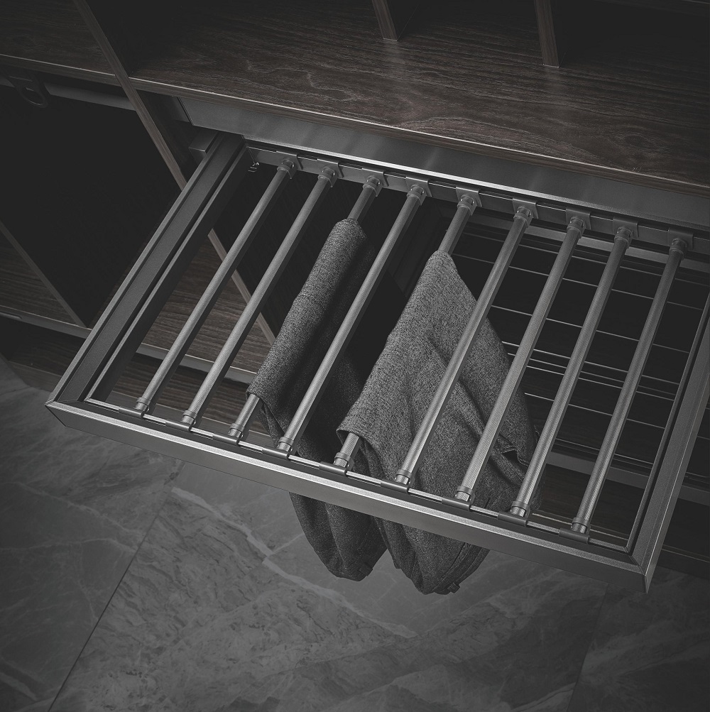 - Держатель для брюк полностью выдвигается из шкафа и обеспечивает удобный доступ к содержимому.