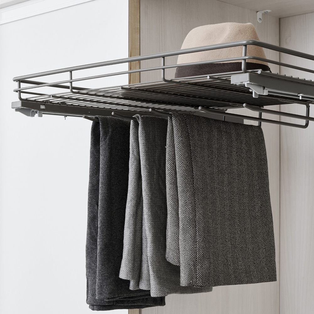 - Выдвижная полка 2 в 1 позволяет организовать оптимальное хранение в шкафу благодаря продуманному конструктиву – сверху расположена корзина для хранения вещей, снизу – рейки для брюк или вешалок.