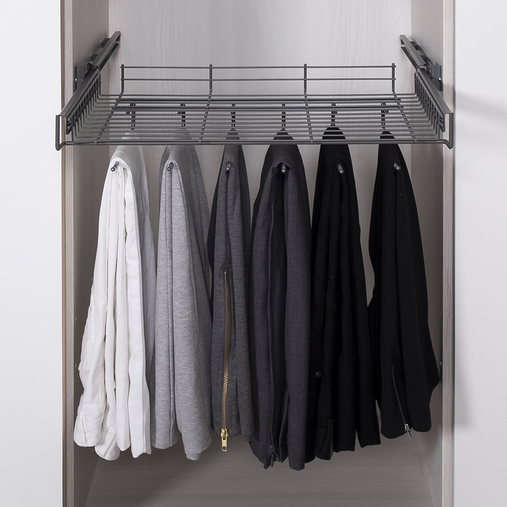 - Выдвижная полка 2 в 1 позволяет организовать оптимальное хранение в шкафу благодаря продуманному конструктиву - сверху расположена корзина для хранения вещей, снизу – рейки для брюк или вешалок.