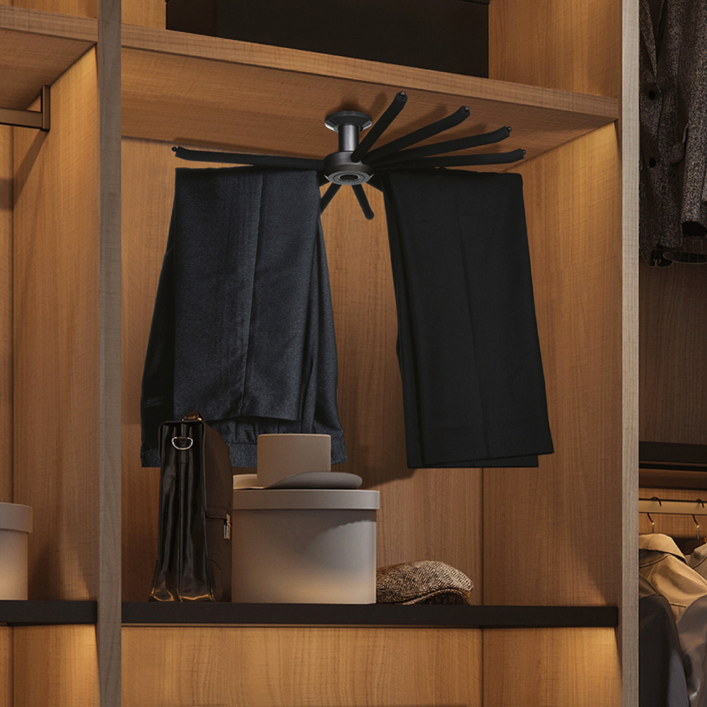 - Поворотная брючница обеспечивает удобство использования – достаточно её прокрутить и выбрать необходимую вещь.