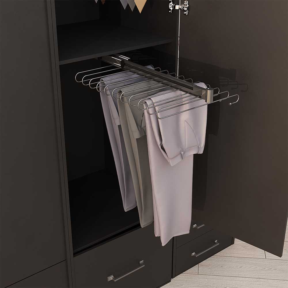 - Брючница выдвигается из шкафа и обеспечивает удобный доступ к содержимому.