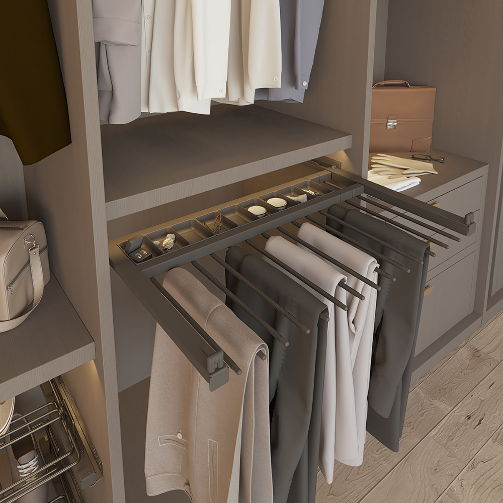 - Держатель для брюк полностью выдвигается из шкафа и обеспечивает удобный доступ к содержимому.