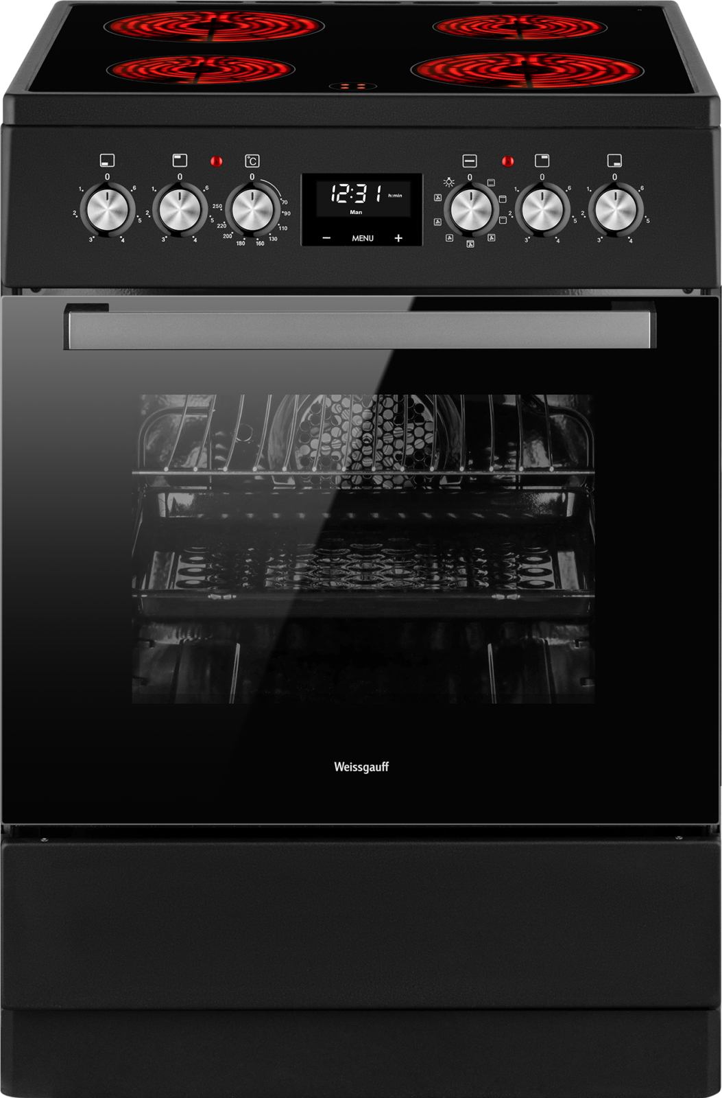 Электрическая отдельностоящая плита Weissgauff, выполненная в черном цвете, оснащенная духовкой с поистине впечатляющим объемом 60 литров, функциями гриля и конвекции, а также стеклокерамической панелью с 4 Hi-Light конфорками, дополненная дисплеем с электронным управлением и утапливаемыми рукоятками PIPO - это наиболее передовая из кухонных плит Weissguff, призванная дать вам максимум возможностей для приготовления по-настоящему вкусной и качественной еды!