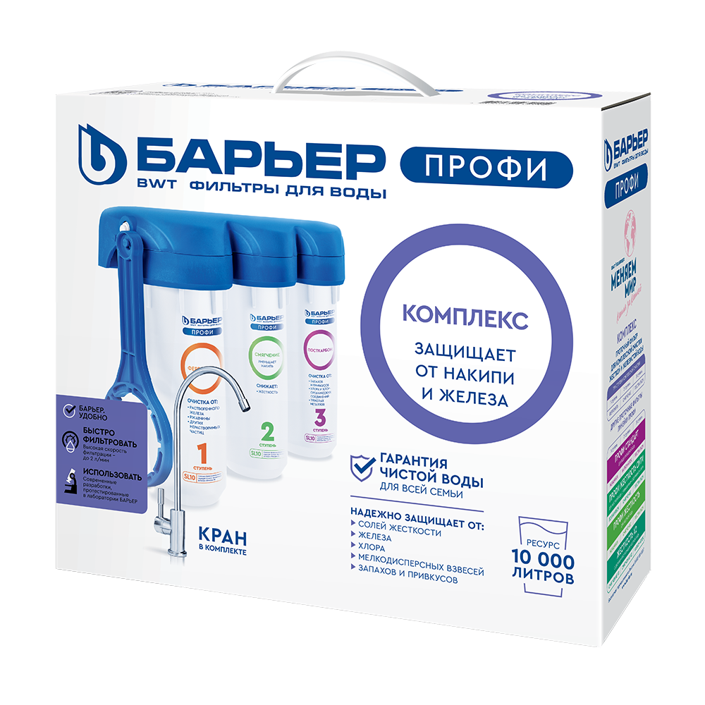 3."БАРЬЕР ПРОФИ ПостКарбон" удаляет остаточный хлор и его побочные продукты, неприятные запахи и привкусы, кондиционирует воду.