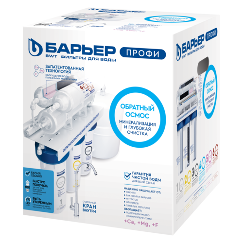 БАРЬЕР МИНЕРАЛИЗАТОР RO – обогащает воду полезными минералами – кальцием, магнием, и фтором. Возвращает воду к физиологически полноценному состоянию после очистки (обессоливанием) обратным осмосом.