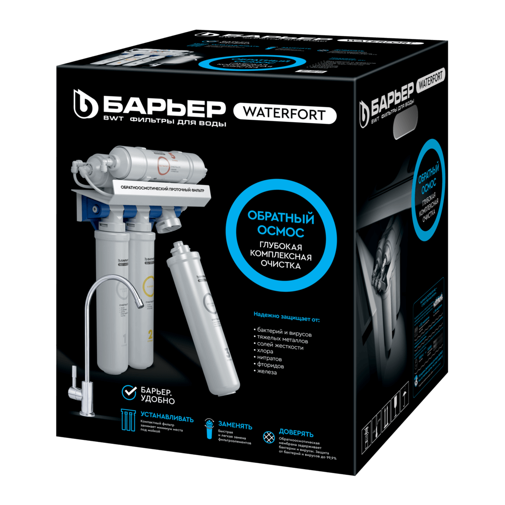 2."БАРЬЕР WaterFort Карбон+" - защита мембраны от хлора. Удаления хлора и хлорорганических соединений, тяжелых токсичных металлов.