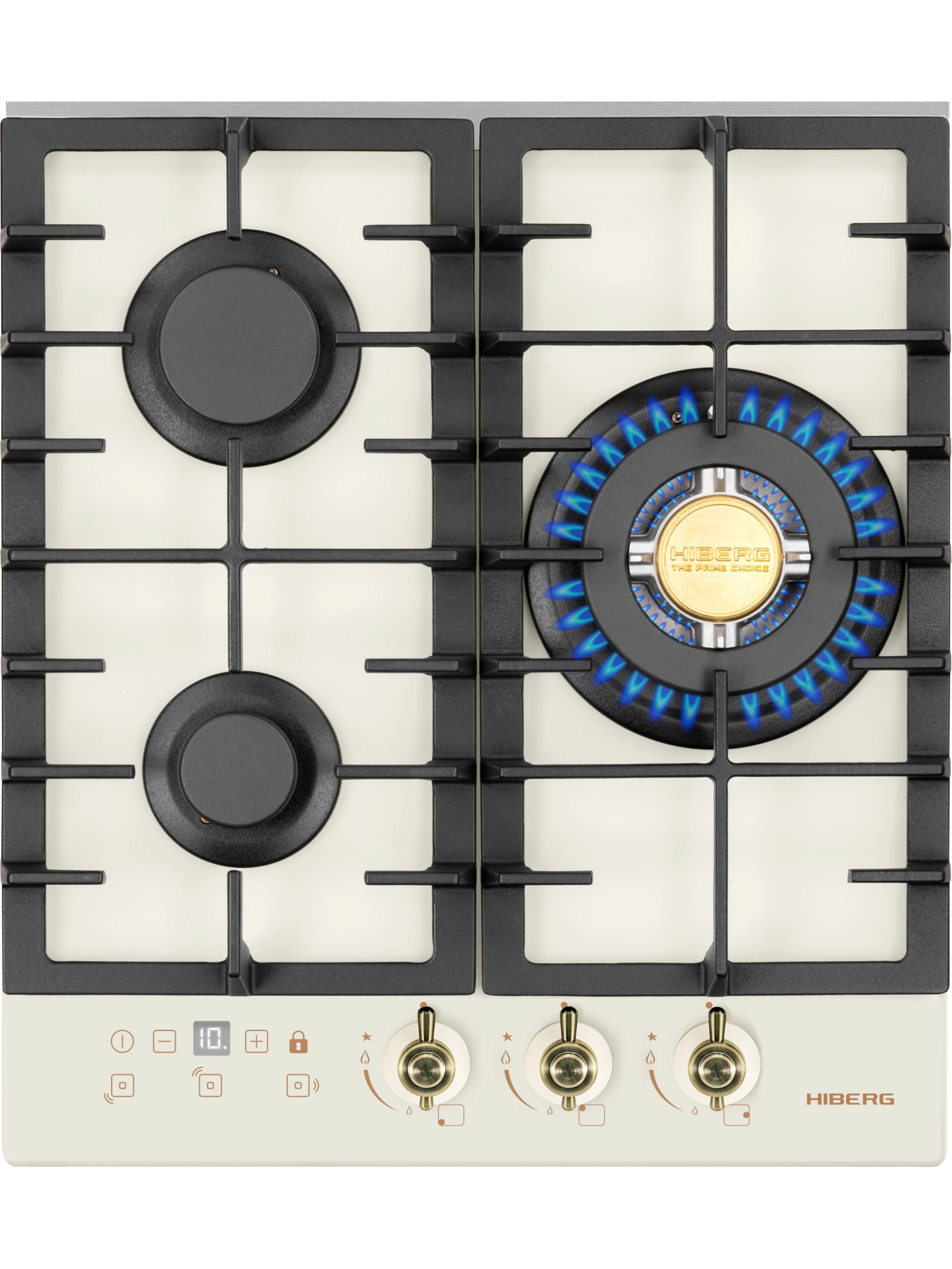 Три конфорки отличаются по диаметру и мощности. Самая большая конфорка WOK с тройным рядом пламени и мощностью 3,4 кВт. Усиленный жар способен быстро нагреть толстостенную глубокую посуду с небольшим диаметром дна для приготовления азиатской кухни. Также на ней можно быстро вскипятить воду, ускорить процесс жарки мясных и рыбных блюд до хрустящей корочки при добавлении небольшого количества жира.