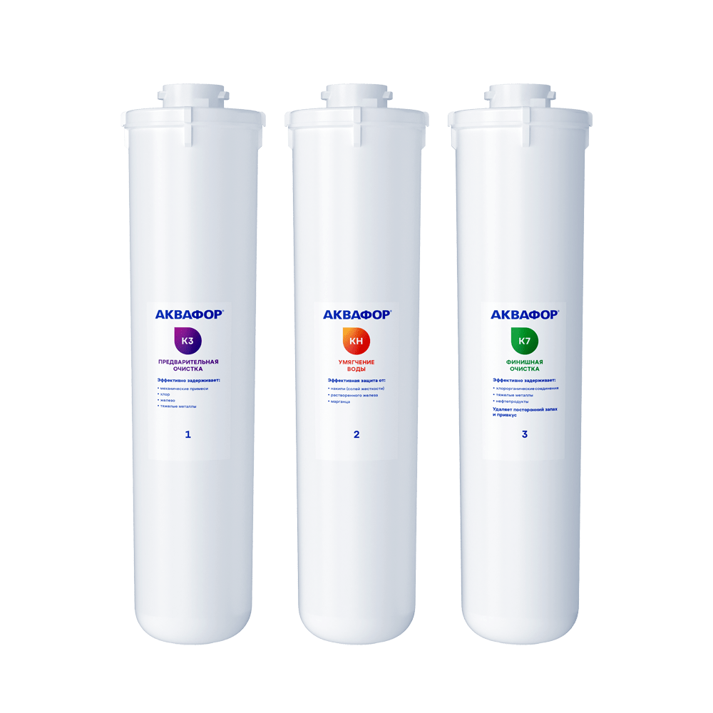 Комплект сменных модулей К3-KН-K7 обеспечивает глубокую очистку воды от хлора, органических соединений и других примесей.