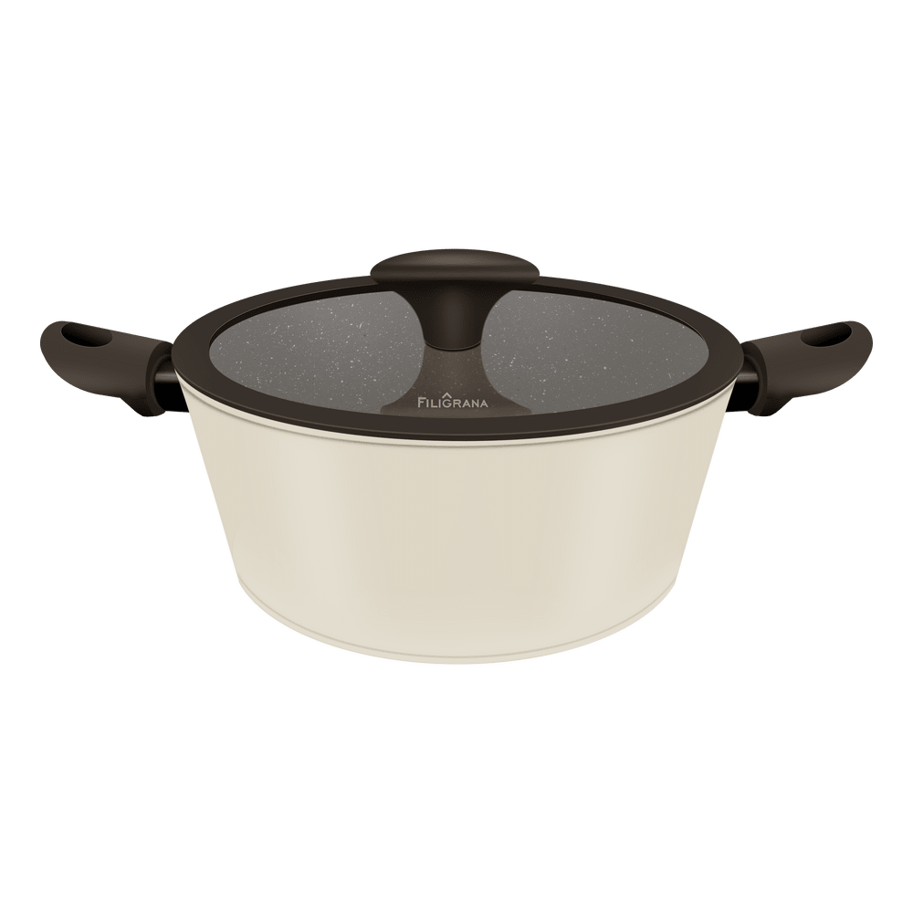 Эргономичные ручки из термостойкого бакелита с покрытием soft-touch не скользят в руке и не нагреваются в процессе приготовления. Плоская трендовая крышка из боросиликатного стекла с паровыпуском и ободком из пищевого силикона.