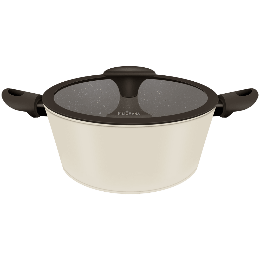 Эргономичные ручки из термостойкого бакелита с покрытием soft-touch не скользят в руке и не нагреваются в процессе приготовления. Плоская трендовая крышка из боросиликатного стекла с паровыпуском и ободком из пищевого силикона.