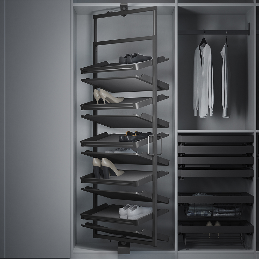 - Уникальная система для хранения обуви: при выдвижении поворачивается и обеспечивает удобный доступ к каждой паре обуви.