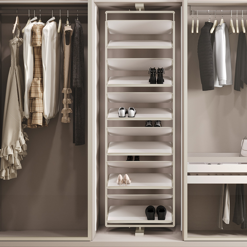 - Уникальная система для хранения обуви: при выдвижении поворачивается и обеспечивает удобный доступ к каждой паре обуви.