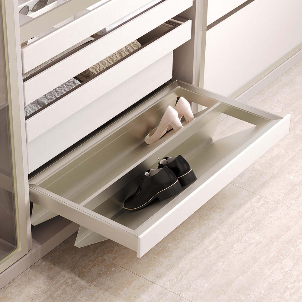 - Рекомендуем установить несколько выдвижных обувниц и ящиков из коллекции друг над другом для организации удобного хранения в шкафу или гардеробной.