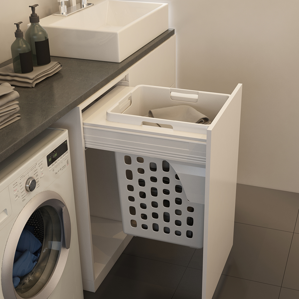 - Система хранения белья устанавливается в постирочных, ванных комнатах или на кухне рядом со стиральной машиной.