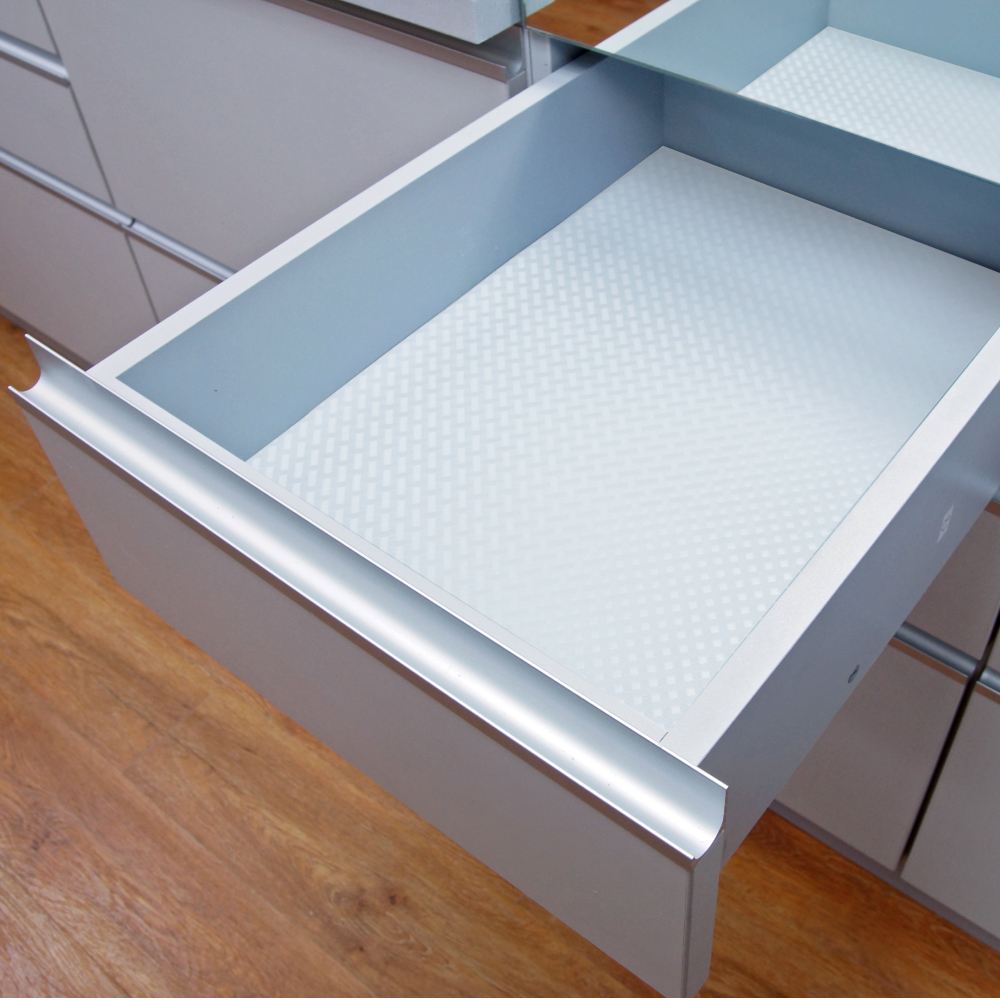 - Коврик имеет двухслойное строение – верхний резиновый защитный слой и нижнюю жесткую основу из пластика, что обеспечивает ящикам и полкам 100% защиту от царапин и даже от глубоких порезов, в случае задевания острым предметом.