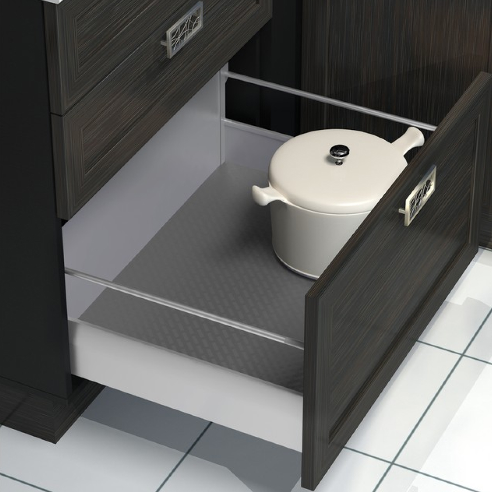 - Коврик имеет двухслойное строение – верхний резиновый защитный слой и нижнюю жесткую основу из пластика, что обеспечивает ящикам и полкам 100% защиту от царапин и даже от глубоких порезов, в случае задевания острым предметом.
