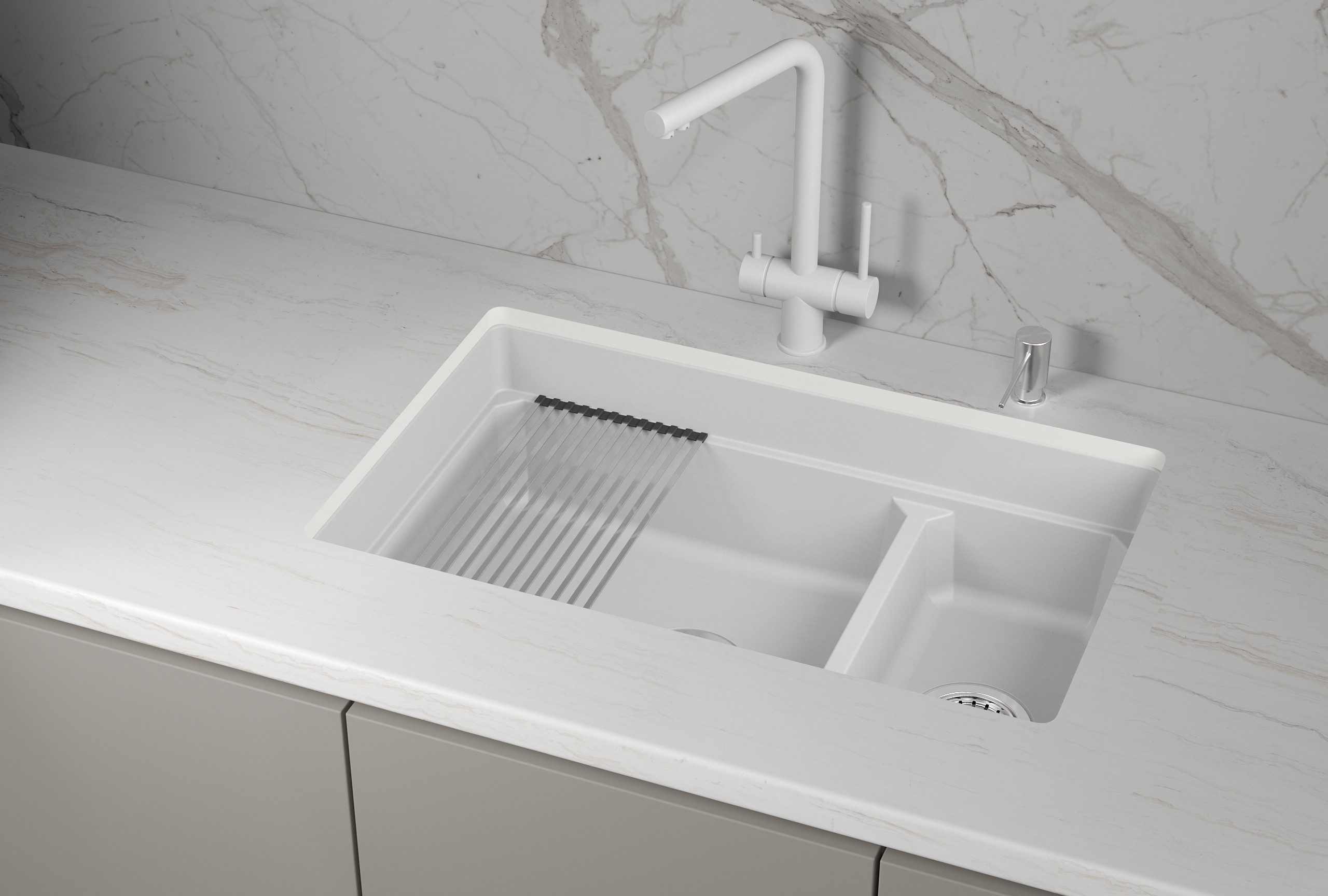 Двухсекционная мойка прямоугольной формы для установки под столешницу в шкаф 800мм. В каждой чаши мойки есть удобная площадка для установки ролл-мата или разделочной доски. Мойка выполнена из кварцевого композитного материала высокой плотности и гигроскопичности, что обеспечивает не менее 20 лет надежной эксплуатации. Ролл-мат и дозатор из нержавеющей стали уже включены в комплект. Выберите GRANULA KS-7804U, чтобы получить привлекательный и удобный аксессуар для вашей кухни.