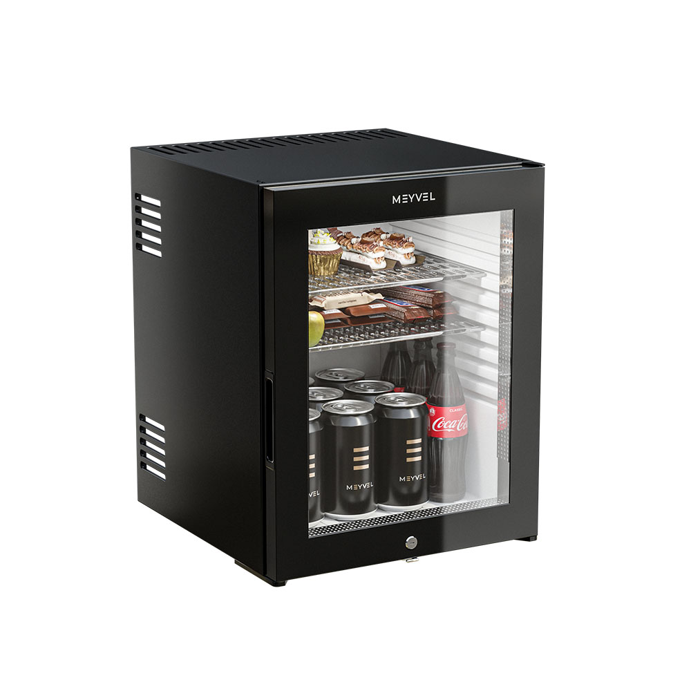 Дверца Meyvel MMT-38BG реверсивная, поэтому устройство адаптируется к конкретным условиям установки, и стеклянная, чтобы видеть содержимое без необходимости открывать мини-бар. Это удобно для гостей отеля или сотрудников офиса.