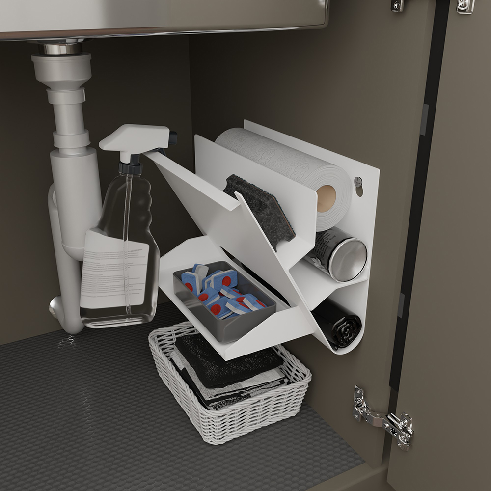 - Удобный и практичный аксессуар, который поможет навести порядок в кухне, постирочной или ванной комнате, организовав удобное и компактное хранение средств для чистки и хозяйственного инвентаря.
