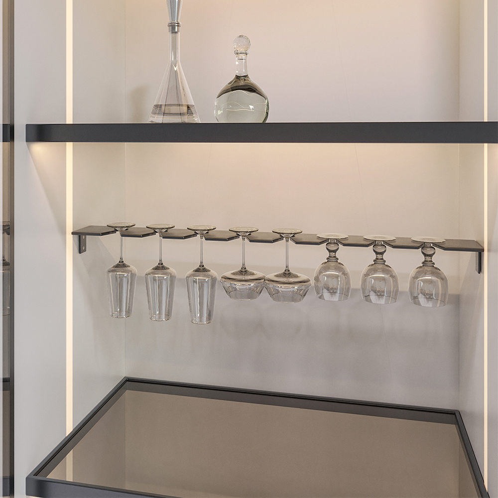 - Держатель для бокалов позволяет эффективно использовать пространство, так как может использоваться в качестве дополнительной полки в шкафу.