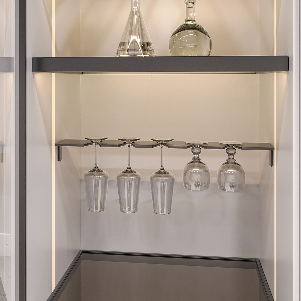 - Держатель для бокалов позволяет эффективно использовать пространство, так как может использоваться в качестве дополнительной полки в шкафу.