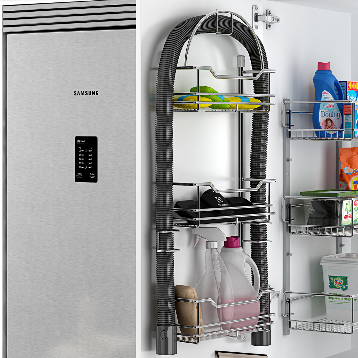 - Держатель для шланга пылесоса с корзинами – это универсальное решение для организации хранения бытовых и чистящих средств в шкафу.