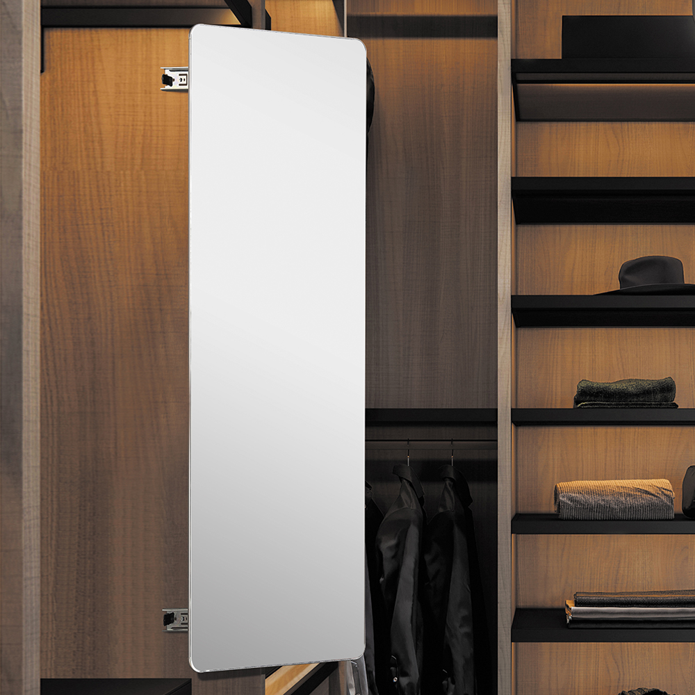 - Выдвижное поворотное зеркало – это идеальный вариант размещения зеркала в домах с маленькими детьми или в интерьерах, где установка зеркал на фасадах шкафов не подходит по дизайну.