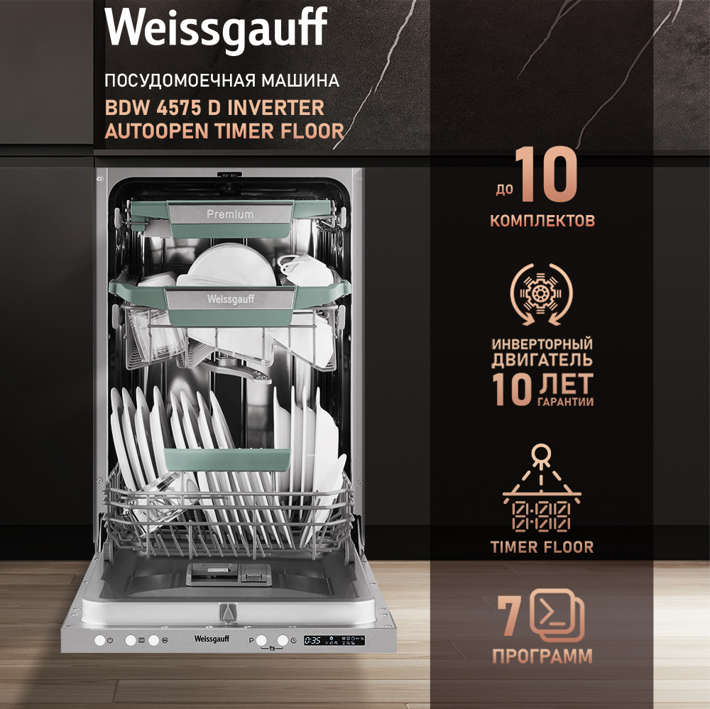 Узкая посудомоечная машина Weissgauff, оснащенная оснащенная проекцией времени до окончания цикла работы на полу, инверторным двигателем и функцией автоматического открытия дверцы, что делает данную модель не только эффективной, но и по-настоящему удобной в работе не только сэкономит место на вашей кухне, но и обеспечит идеальный результат: 3 корзины позволят расположить посуду оптимальным образом для достижения наилучшего качества мытья, а наличие 7 программ позволит подобрать оптимальный режим в зависимости от количества посуды и степени загрязнения.