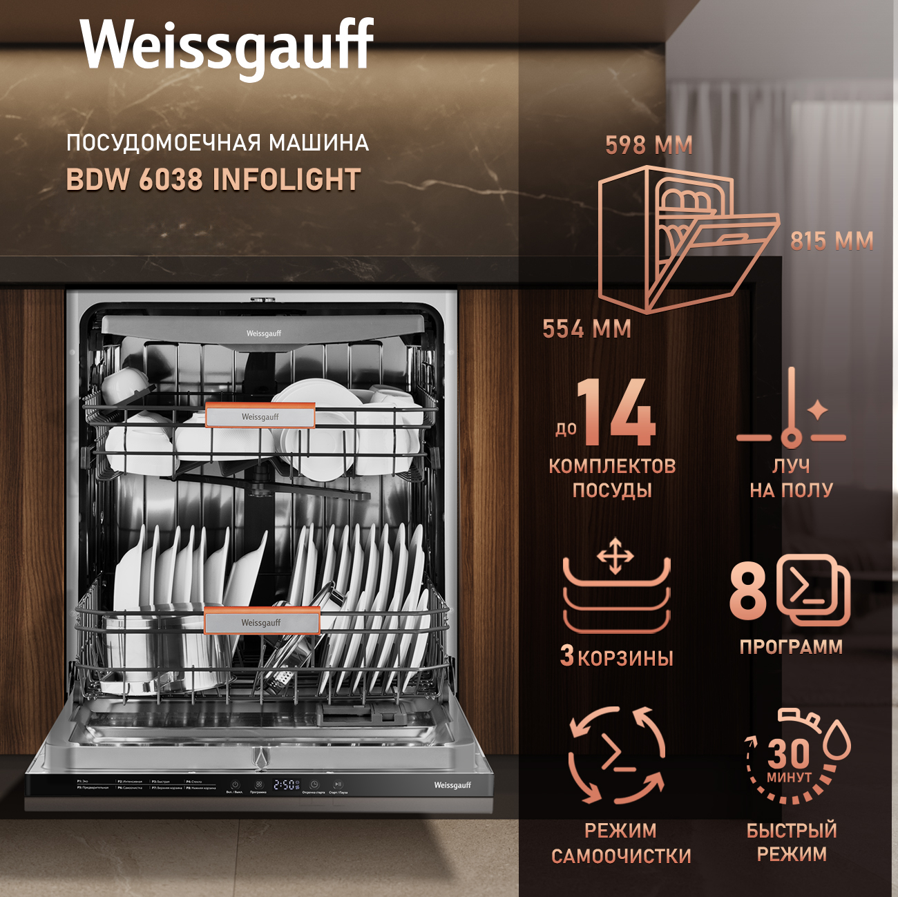 Полноразмерная посудомоечная машина Weissgauff, обладающая вместимостью до 14 комплектов посуды с функцией "Луч на полу", не только удивит богатством функциональных решений, но и обеспечит идеальный результат а наличие 8 программ для мытья позволит подобрать оптимальный режим в зависимости от количества посуды и степени загрязнения.