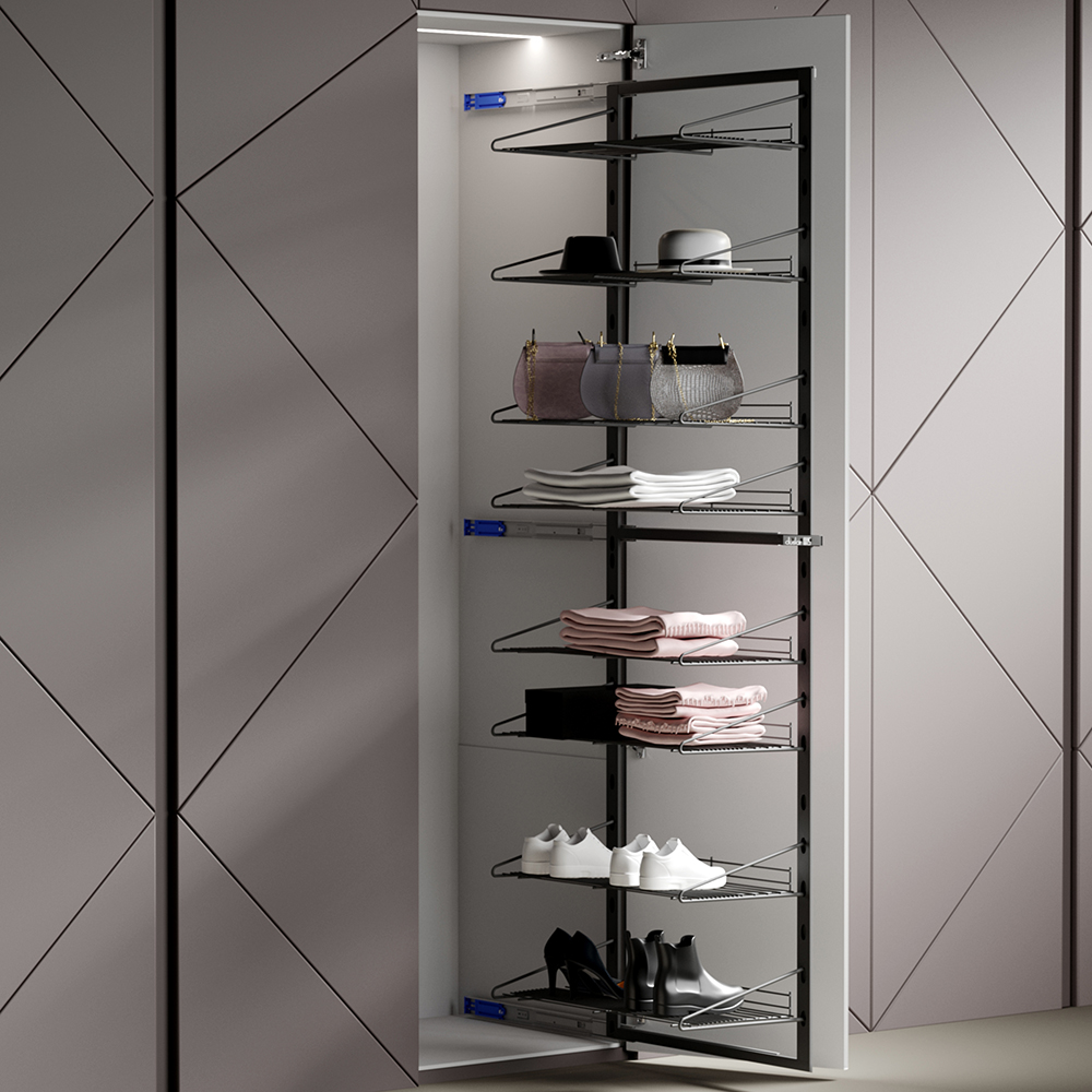 - Система выдвигается из шкафа и обеспечивает полный обзор и доступ к содержимому.
