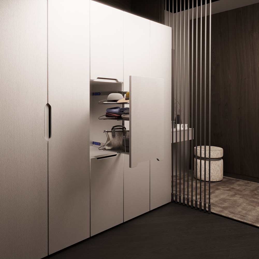 - Функциональное решение для организации хранения сумок, головных уборов, обуви и других аксессуаров в высоких секциях с выдвижным фасадом.