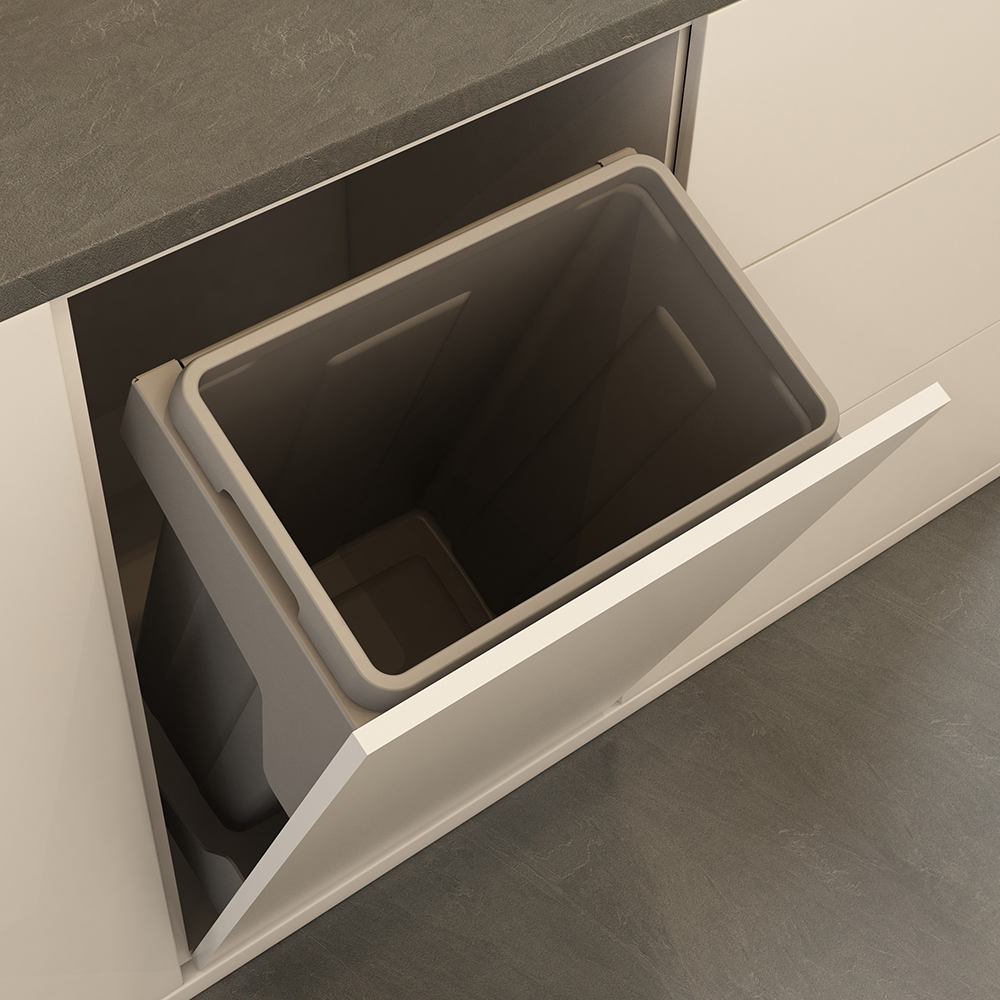 - Откидной фасад позволяет легко и быстро открыть и закрыть мусорное ведро, не прерывая процесс готовки или другой деятельности на кухне.
