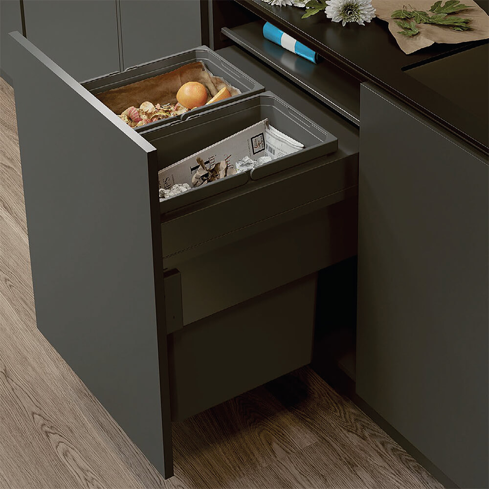 - Ведра выдвигаются вместе с фасадом, крышка остается внутри корпуса.