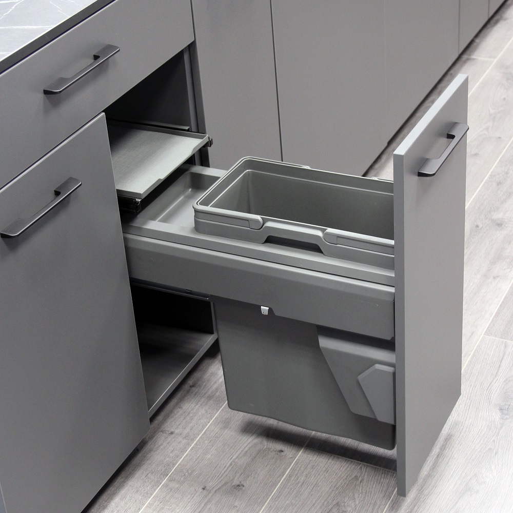 - Ведро выдвигается вместе с фасадом, полка-крышка может выдвигаться отдельно.