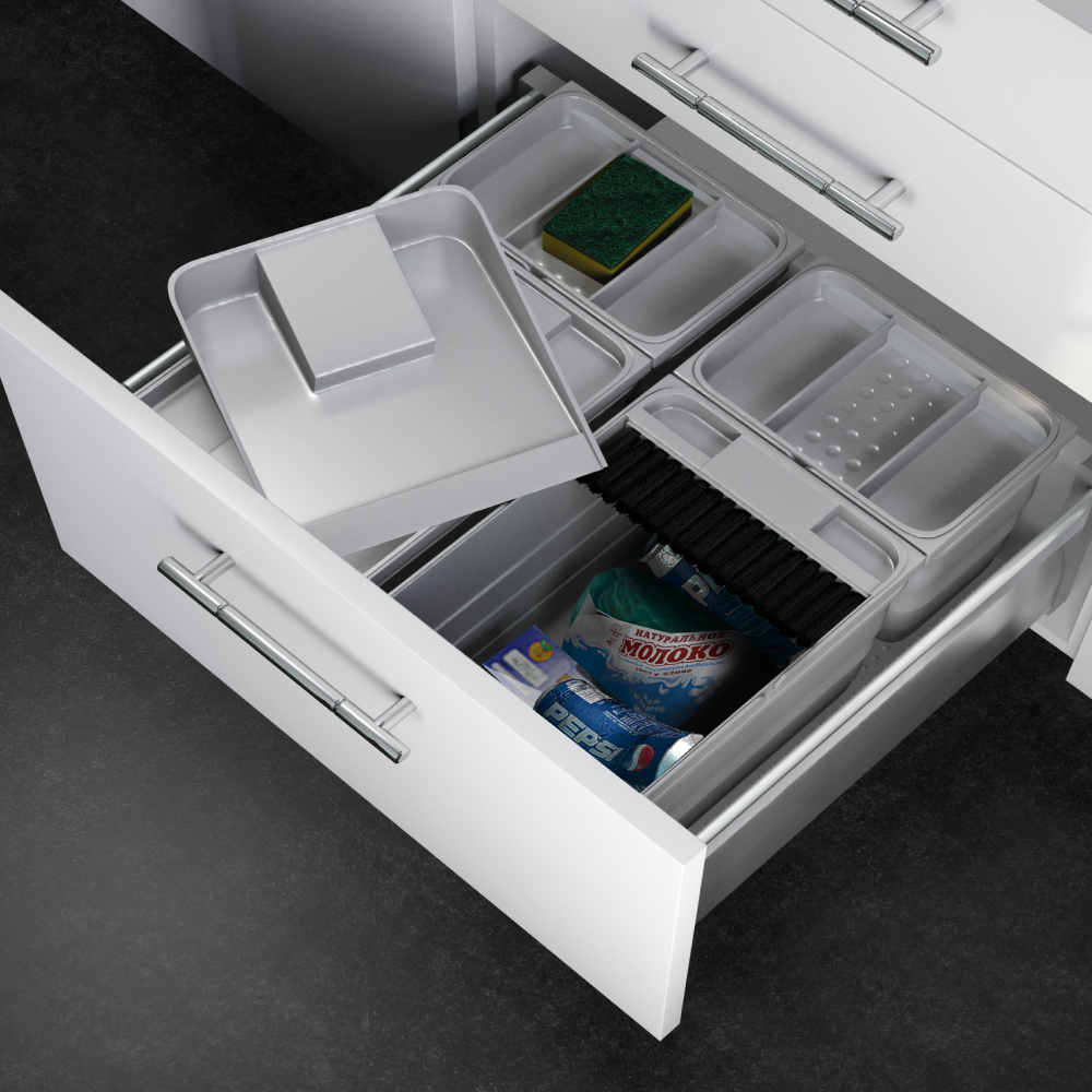 - Систему можно использовать как для раздельного сбора бытового мусора, так и для хранения хозяйственных средств.