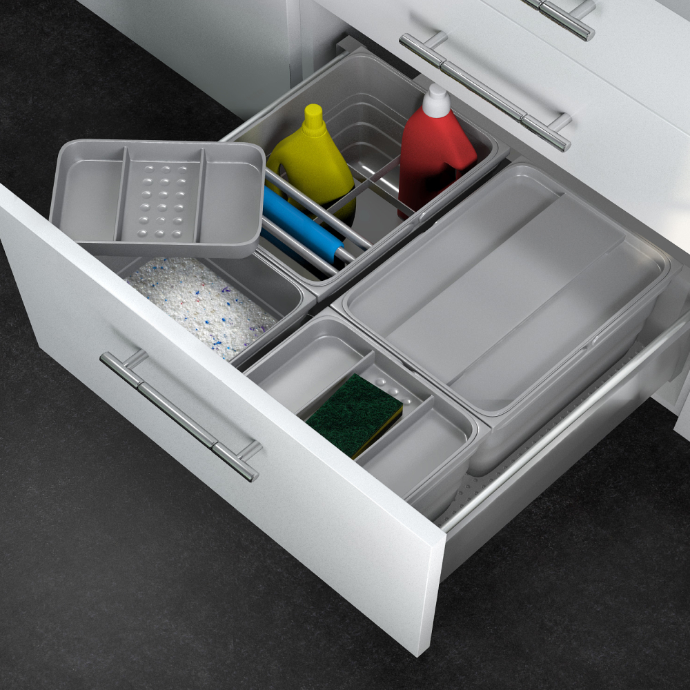 - Систему можно использовать как для раздельного сбора бытового мусора, так и для хранения хозяйственных средств.