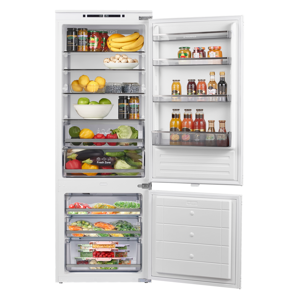 Встраиваемый двухкамерный холодильник шириной 69 см и высотой 193 см TOTAL NO FROST с инверторным компрессором и многопоточным охлаждением, с большой светящейся LED панелью на задней стенке и широкой сенсорной панелью управления, зоной свежести Fresh Zone и тонированными выкатными ящиками с металлизированной отделкой