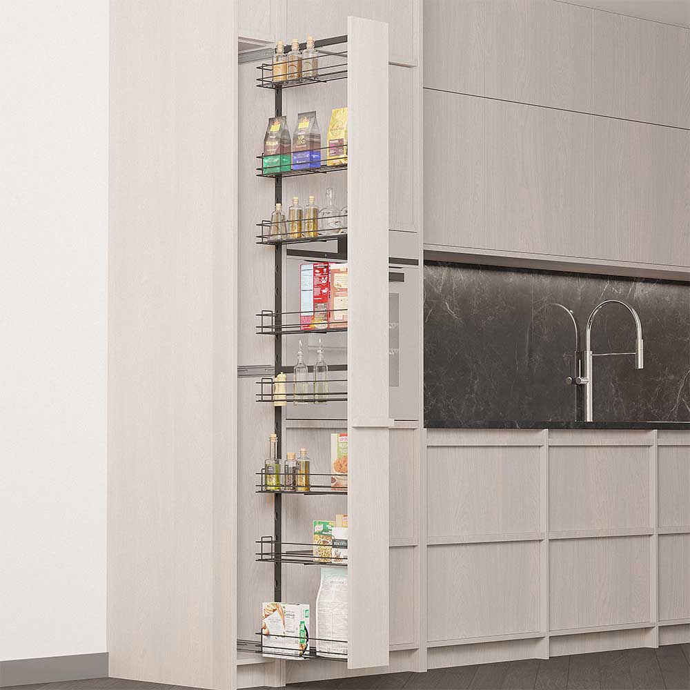 - Функциональное решение для организации хранения большого количества банок, бутылок, соусов и других предметов в высоких узких секциях.