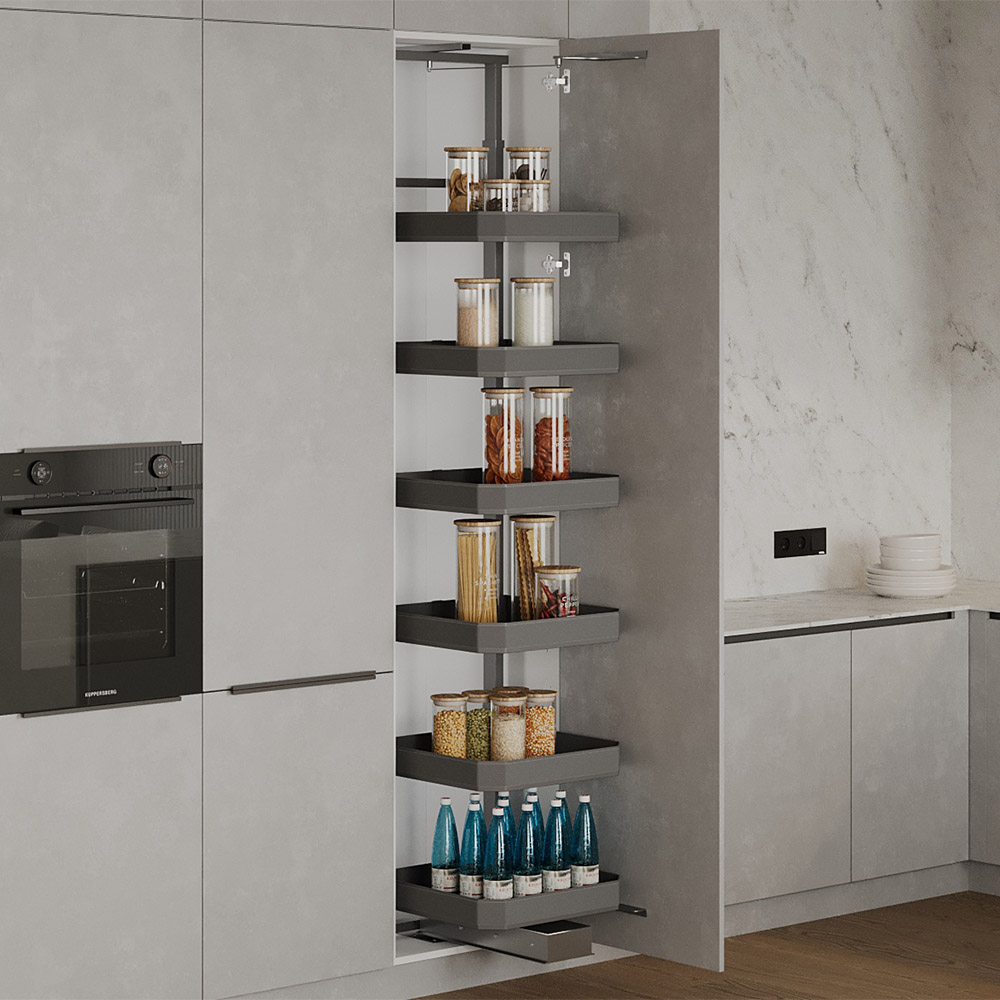- Все корзины можно переставлять на раме по высоте, таким образом в системе можно хранить продукты и кухонные принадлежности разной высоты.