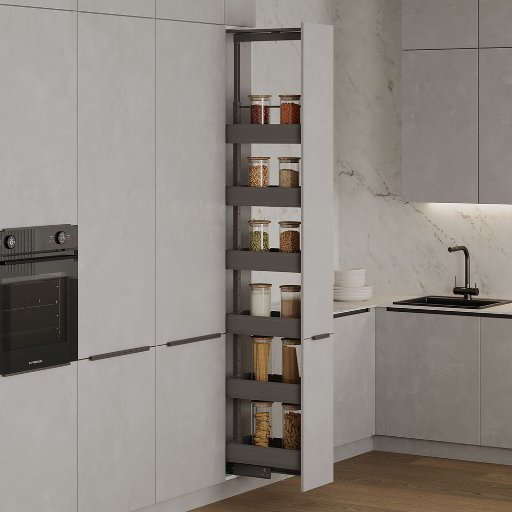 - Высокая система в шкаф колонну – это функциональное решение для организации хранения, которое позволяет удобно разместить бутылки с маслом, соусы и баночки со специями.