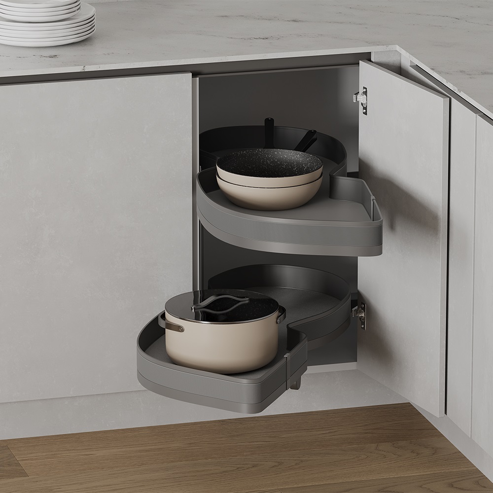- Карусель обеспечивает удобный доступ к пространству углового шкафа и позволяет максимально эффективно использовать все пространство.