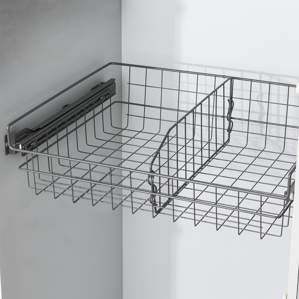 - Выдвижная корзина позволяет рационально использовать пространство в шкафу, обеспечивая быстрый и удобный доступ к содержимому.