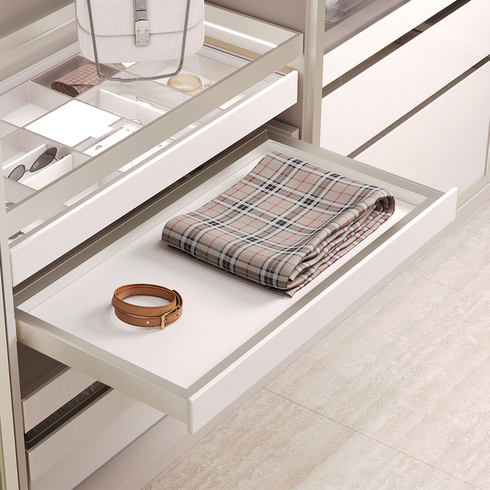 - Рекомендуем установить несколько выдвижных ящиков из коллекции друг над другом для организации удобного хранения в шкафу или гардеробной.