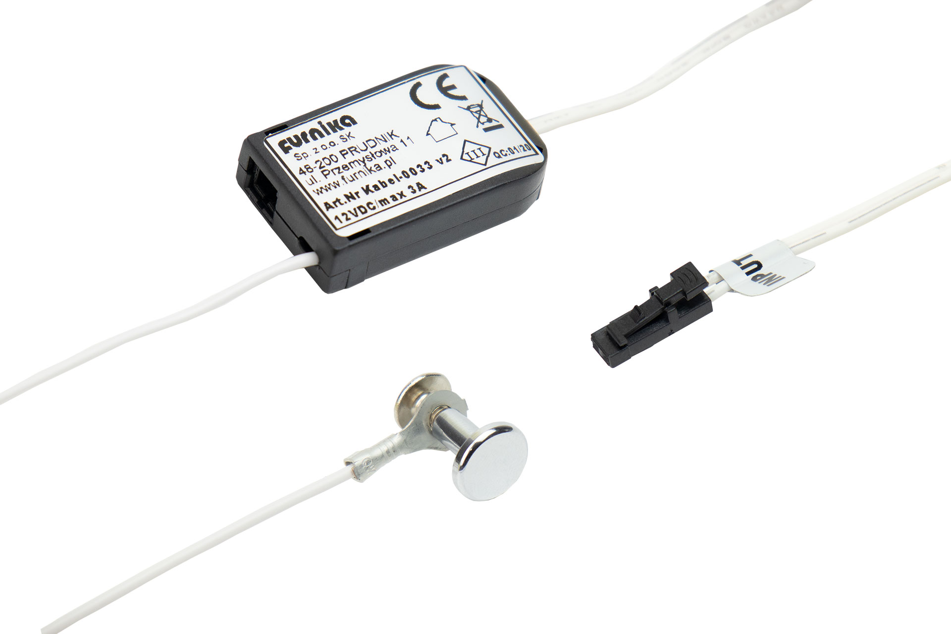 - Датчик врезной для ДСП 16-20 мм с встроенным кабелем 0,6 м для подключения датчика и кабелем 0,25 м с мини-штекером для подключения к трансформатору – 1 шт.