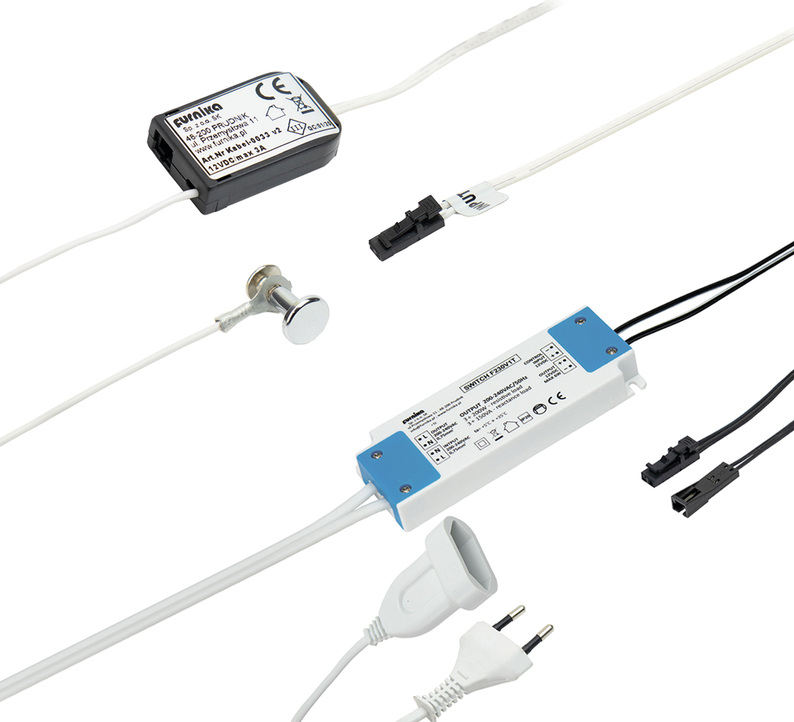 - Сенсорный выключатель мягкого касания TOUCH SWITCH с блоком-выключателем, сетевым кабелем 2 м и вилкой, кабелем с розеткой 0,3 м и кабелями для подключения выключателя 0,2 м – 1 шт.